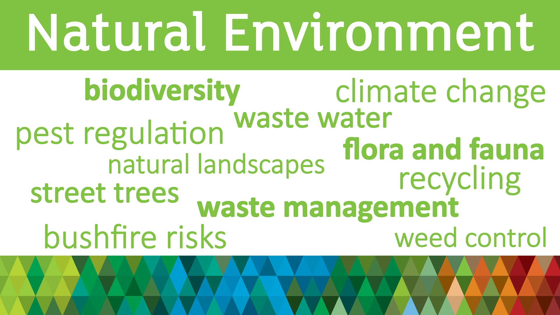 We recognise the importance of healthy and resilient natural systems that deliver the key environmental benefits (ecosystem services) on which our quality of life depends. These include provision of clean air and water, natural elimination of waste and pollution, recycling of nutrients, carbon sequestration, pestregulation, pollination, and sustained agricultural productivity.To protect and maintain the region’s distinctive native flora and fauna, unique vegetation communities, productive farming lands, urban and vibrant township communities, we are committed to managing biodiversity conservation, protecting the watershed, responding to the impacts of climate change, and managing waste and resources.By engaging the community, fostering productive partnerships and through best-practice environmental stewardship, we aim to manage the known and emerging threats and opportunities to support the important natural values of the region and improve environmental outcomes.In recognition of our international obligations we have declared a climate emergency and are firmly resolved to protect and improve the quality and resilience of our environment.With this in mind, to support our aspiration we've developed five objectives and related priorities.Tell us what you think of:- The Objectives